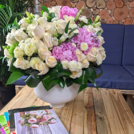 Price: $440.00 Chick Flower Design with Peonies, Garden Roses and Mixed Flowers Product Tags: Next-day Delivery